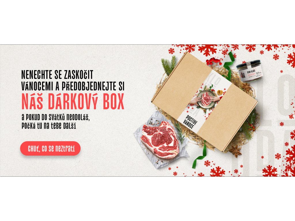 Vánočním boxem uděláte radost všem milovníkům dobrého jídla. Vánoční box s masem obsahuje 600g Vysoký roštěnec s kostí a sklenici našeho Demi-glace 180g. Trvanlivost je 11 dní od expedice, dbejte tedy na správné načasování objednávky.